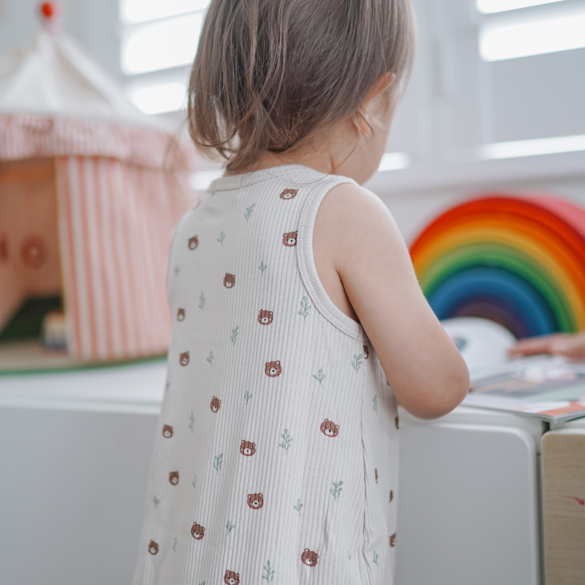 - Print in Woodland Bear - Cute little bears and leafy accents bring a touch of adventure to a warm taupe-beige base.